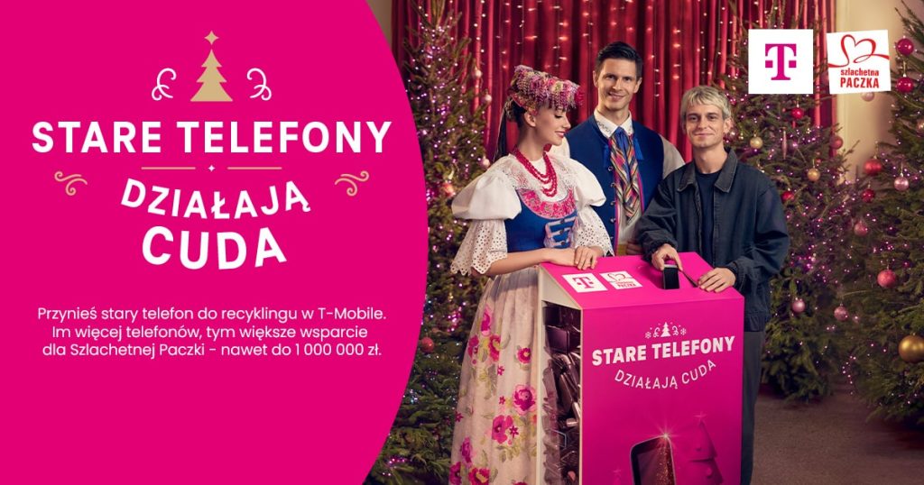 Już trzeci rok z rzędu T-Mobile i Szlachetna Paczka poprzez akcję „Stare telefony działają cuda” łączą recykling starych telefonów z realną, mądrą pomocą. Im więcej telefonów zostanie przyniesionych do recyklingu do sklepów T-Mobile, tym większe wsparcie finansowe od T-Mobile trafi do Szlachetnej Paczki. Dzięki przekazanym środkom Szlachetna Paczka może działać i docierać do kolejnych rodzin w potrzebie. Kto by pomyślał, że zapomniany, bezużyteczny lub niedziałający telefon może czynić cuda. Cuda przywracania nadziei, przełamywania barier, łączenia tych, którzy potrzebują pomocy, z tymi, którzy są w stanie ją zaoferować.