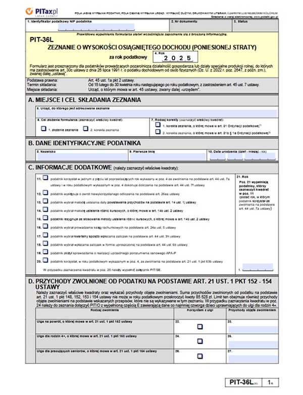 Jeśli rozliczasz dochody opodatkowane podatkiem liniowym, z działalności gospodarczej bądź z działów specjalnych produkcji rolnej, odpowiednim formularzem do rozliczenia podatku za 2025 rok jest formularz PIT 36L.